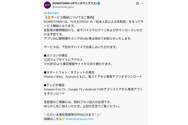 アプリの公開時間やストアのURL等は改めてお知らせいたします。…— DOWNTOWN+(ダウンタウンプラス) (@downtown_plus) October 24, 2025