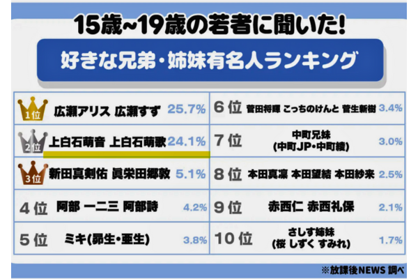 2025年に行われた「理想の芸能人姉妹ランキング」では、広瀬姉妹に続いて上白石姉妹が2位にランクイン。