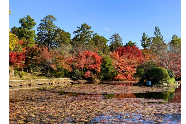 紅葉が美しく色づく時期には、庭園全体が赤と黄色の絨毯を敷き詰めたような景色に変わります。