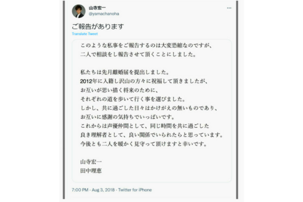 山寺さんはこれまでにも、声優のかないみかさん、田中理恵さんとの結婚・離婚を経験しています。